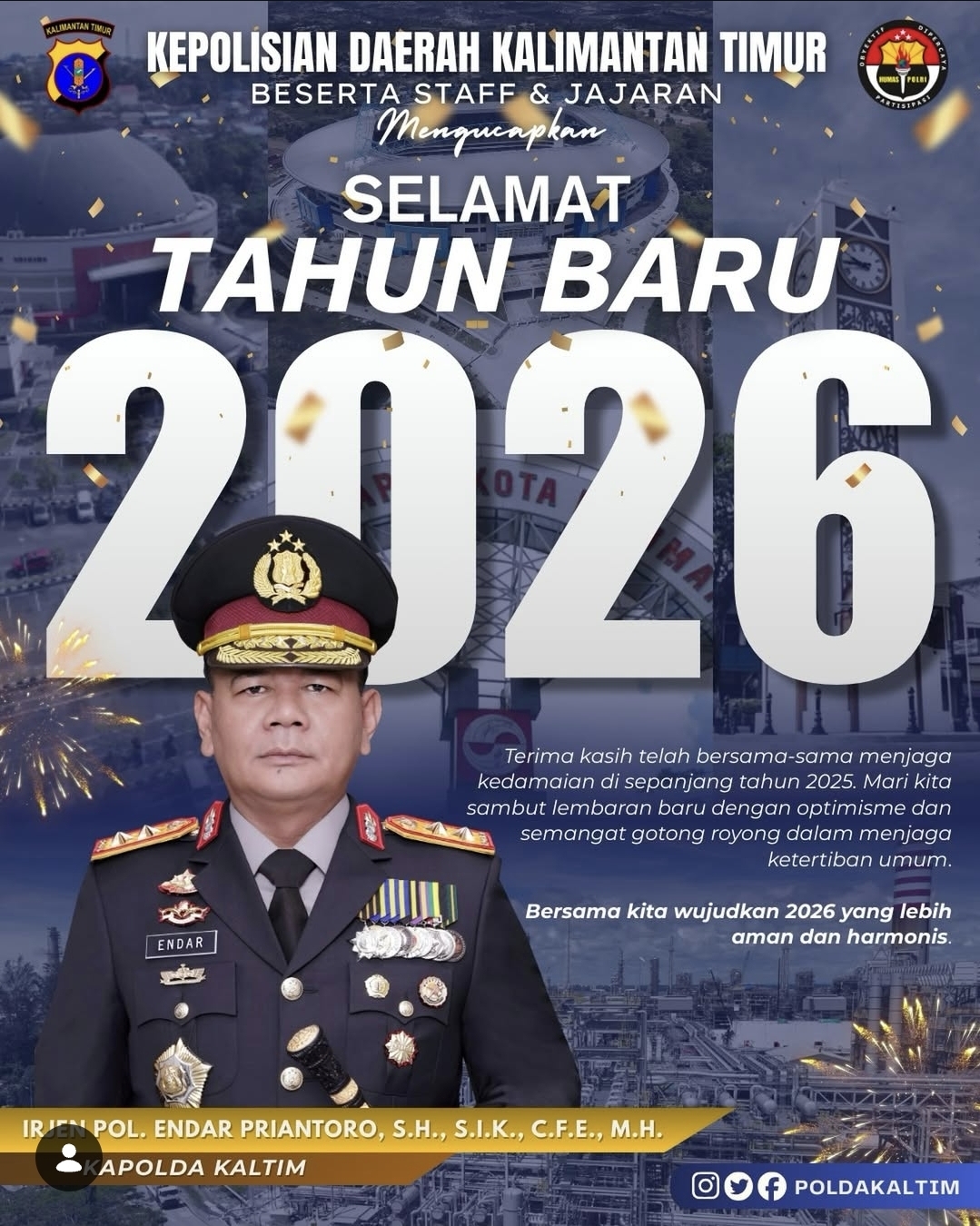 Kapolda Kalimantan Timur, Irjen Pol. Endar Priantoro, S.H., S.I.K., C.F.E., M.H., menyampaikan apresiasi mendalam kepada seluruh lapisan masyarakat atas sinergi dalam menjaga kedamaian sepanjang tahun 2025. Memasuki tahun 2026, beliau menekankan pentingnya semangat gotong royong dan optimisme tinggi untuk menjaga ketertiban umum. Melalui momentum pergantian tahun ini, Polda Kaltim berkomitmen untuk terus berkolaborasi dengan warga demi mewujudkan wilayah Kalimantan Timur yang lebih aman, harmonis, dan tertib.