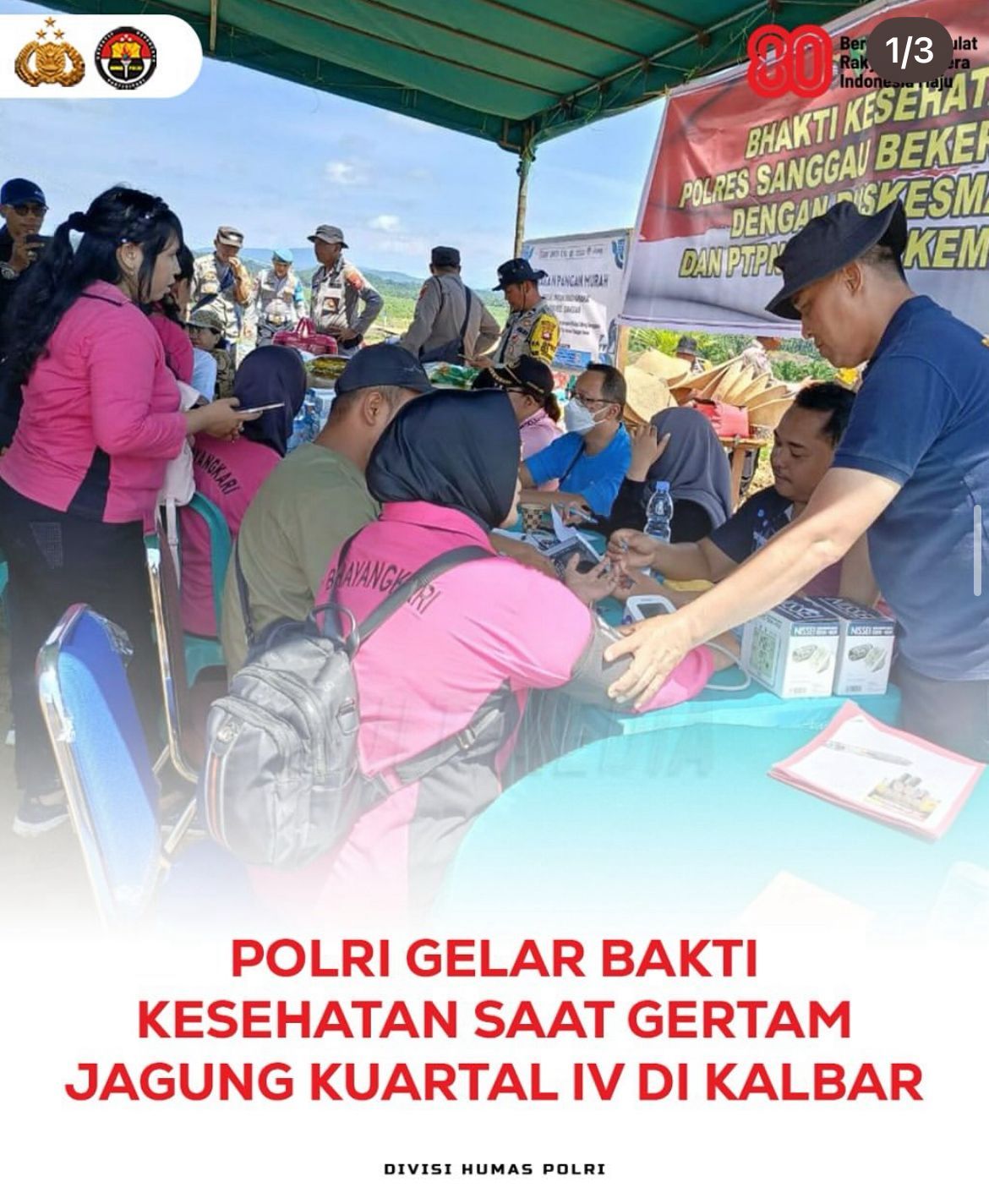 divisihumaspolri Polri melalui Polres Sanggau, Polda Kalimantan Barat (Kalbar), menggelar kegiatan Bakti Kesehatan di lokasi Gerakan Tanam Jagung (Gertam) Kuartal IV Tahun 2025 di Dusun Rantau, Kembayan, Kalbar, Rabu (8/10). Pelayanan kesehatan yang diberikan meliputi pemeriksaan tekanan darah, pemberian obat-obatan ringan, serta konsultasi kesehatan gratis bagi masyarakat dan petani. Tujuan kegiatan ini mendukung ketahanan pangan sekaligus mempererat hubungan Polri dengan masyarakat di wilayah pertanian. Polri berkomitmen hadir dalam meningkatkan kesejahteraan dan kesehatan masyarakat tani.