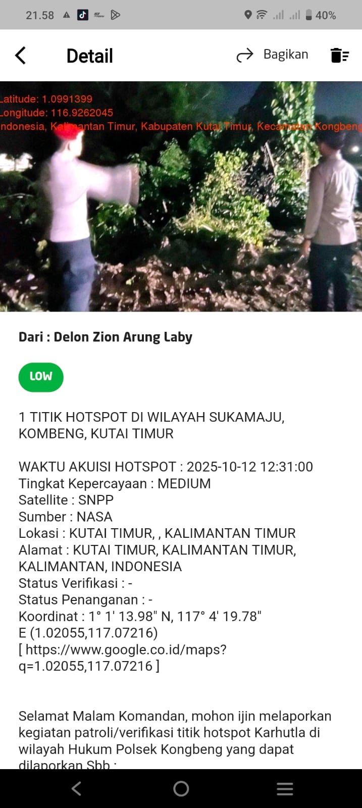 Selamat Malam Komandan, mohon ijin melaporkan kegiatan patroli/verifikasi titik hotspot Karhutla di wilayah Hukum Polsek Kongbeng yang dapat dilaporkan Sbb :