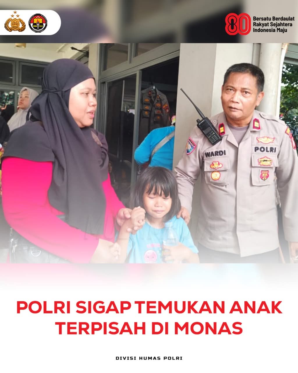 Polri melalui Polres Metro Jakarta Pusat, Polda Metro Jaya sigap menemukan dan mempertemukan kembali anak-anak tersebut dalam keadaan selamat di tengah kemeriahan HUT ke-80 TNI di Monas, Jakarta, Minggu (5/10). Posko Polsubsektor Patung Kuda difungsikan sebagai pusat pengaduan dan layanan masyarakat. Suasana haru mewarnai pertemuan keluarga yang kembali dipertemukan. Polri menunjukkan bahwa pengamanan tak hanya soal ketertiban, tapi juga tentang kemanusiaan.