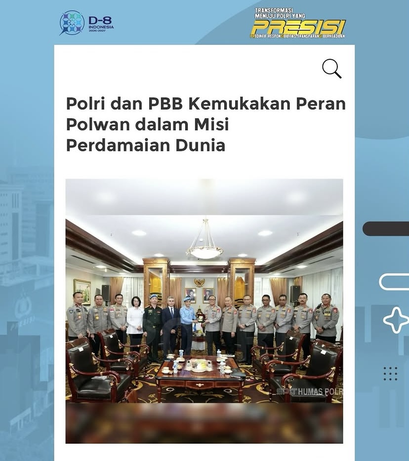 mendorong kesetaraan gender dan memperkuat peran Polisi Wanita (Polwan) dalam misi perdamaian dunia melalui kerja sama dengan United Nations Police Division. Hal ini disampaikan dalam pertemuan dengan UN Police Adviser Faisal Shahkar di Mabes Polri, Senin (20/4), yang menekankan pentingnya peningkatan keterwakilan perempuan, termasuk di posisi kepemimpinan. Wakapolri Komjen Pol. Prof. Dr. Dedi Prasetyo, S.H., M. Hum., M.St., M.M., menyatakan Polri terus membuka ruang setara bagi Polwan, baik pada fungsi operasional maupun posisi strategis di level internasional.