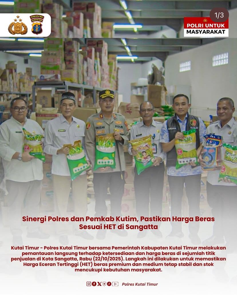 Sinergi Polres dan Pemkab Kutim, Pastikan Harga Beras Sesuai HET di Sangatta KUTAI TIMUR — Polres Kutai Timur bersama Pemerintah Kabupaten Kutai Timur melakukan pemantauan langsung terhadap ketersediaan dan harga beras di sejumlah titik penjualan di Kota Sangatta, Rabu (22/10/2025).
